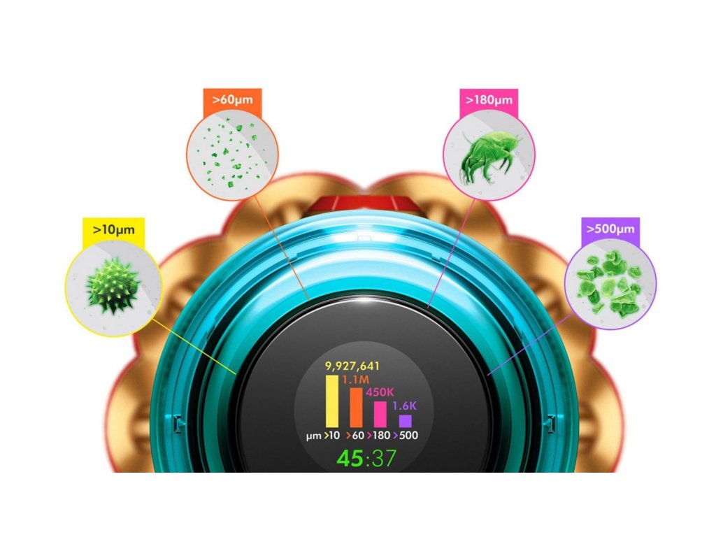 A fejlettpiezoszenzor- technológiánakköszönhetően a készülék folyamatosan méri és számolja a mikroszkopikus porrészecskéket, és szükség szerint automatikusan beállítja a szívóerőt.A Dyson Hyperdymium™motor akár 125 000 fordulat/perc sebességet is elérhet, kivételes, 140 AW szívóteljesítményt biztosítva mindenféle felület teljes és alapos tisztításához.